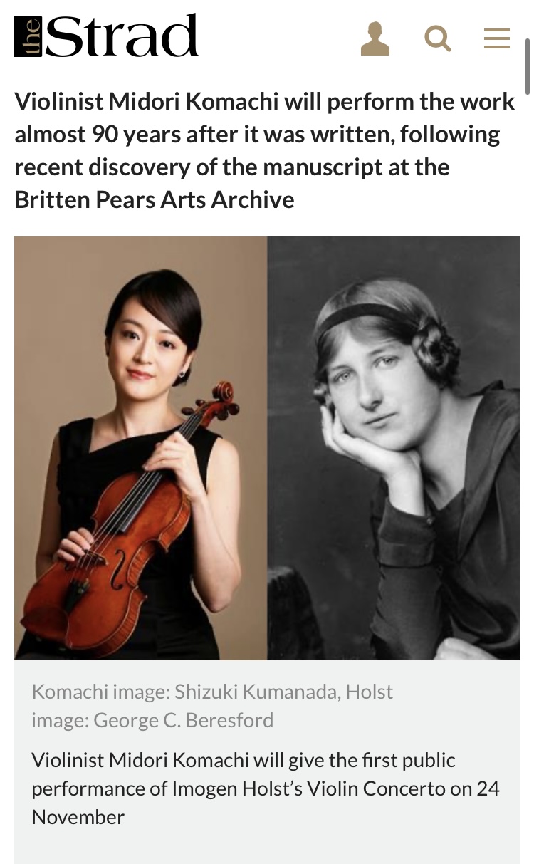 Komachi’s initiative, sparked by her research and discovery of the manuscript of the Concerto for Violin and Strings by Imogen Holst at the Archive, Britten Pears Arts in Aldeburgh, has resulted in the score publication by Faber Music and a series of events this year.